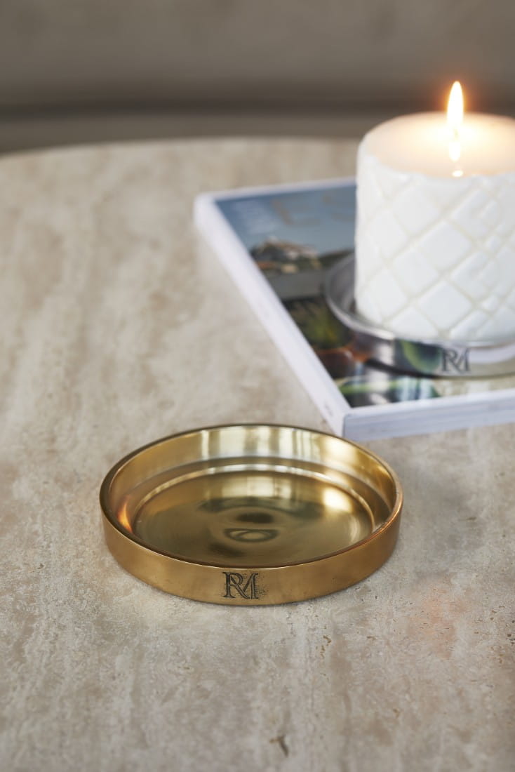 Ta złota taca z kultowym monogramem RM to nie tylko piękna podstawa dla Twoich świec, ale także subtelna elegancja w Twoim wnętrzu.