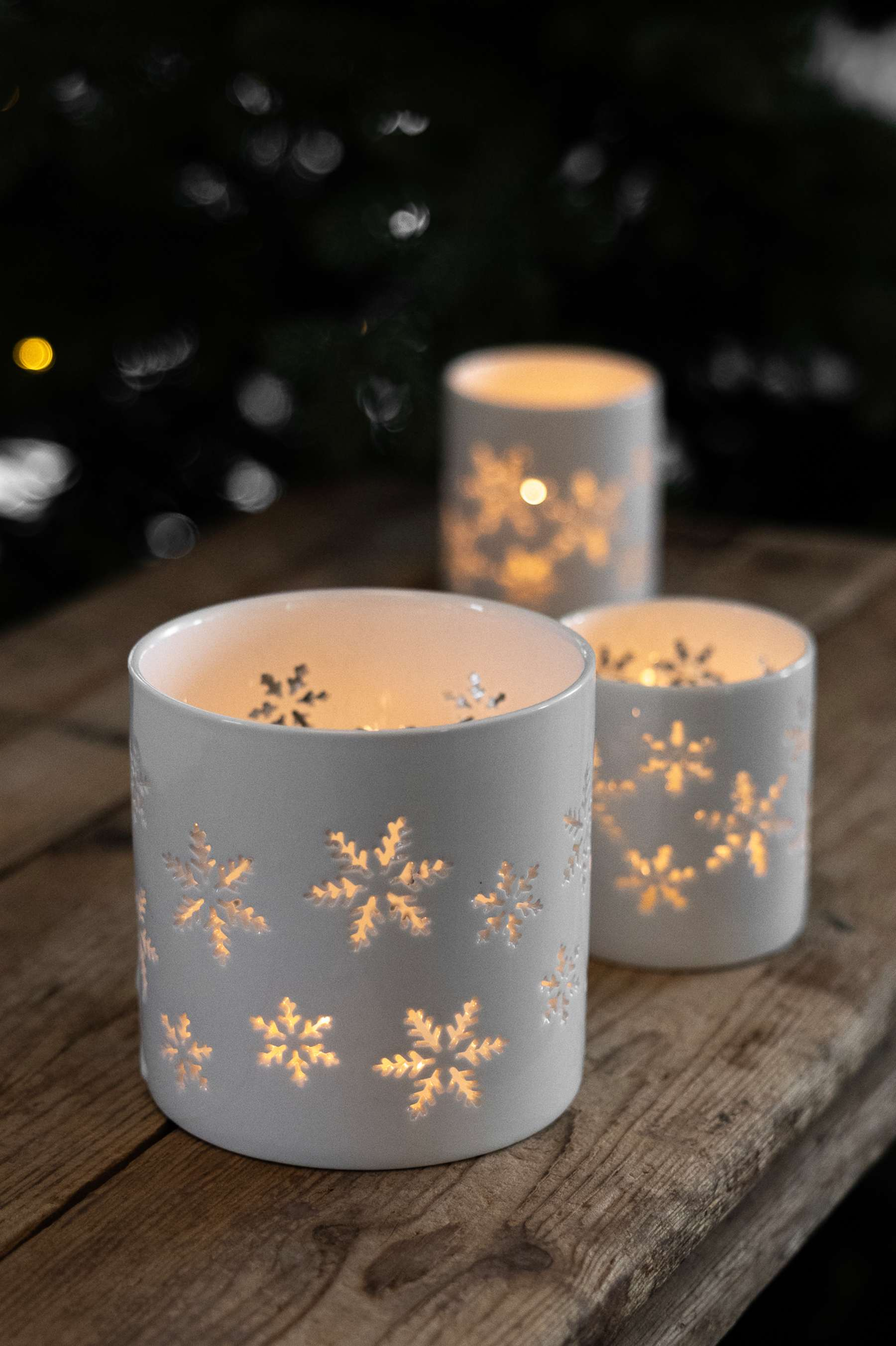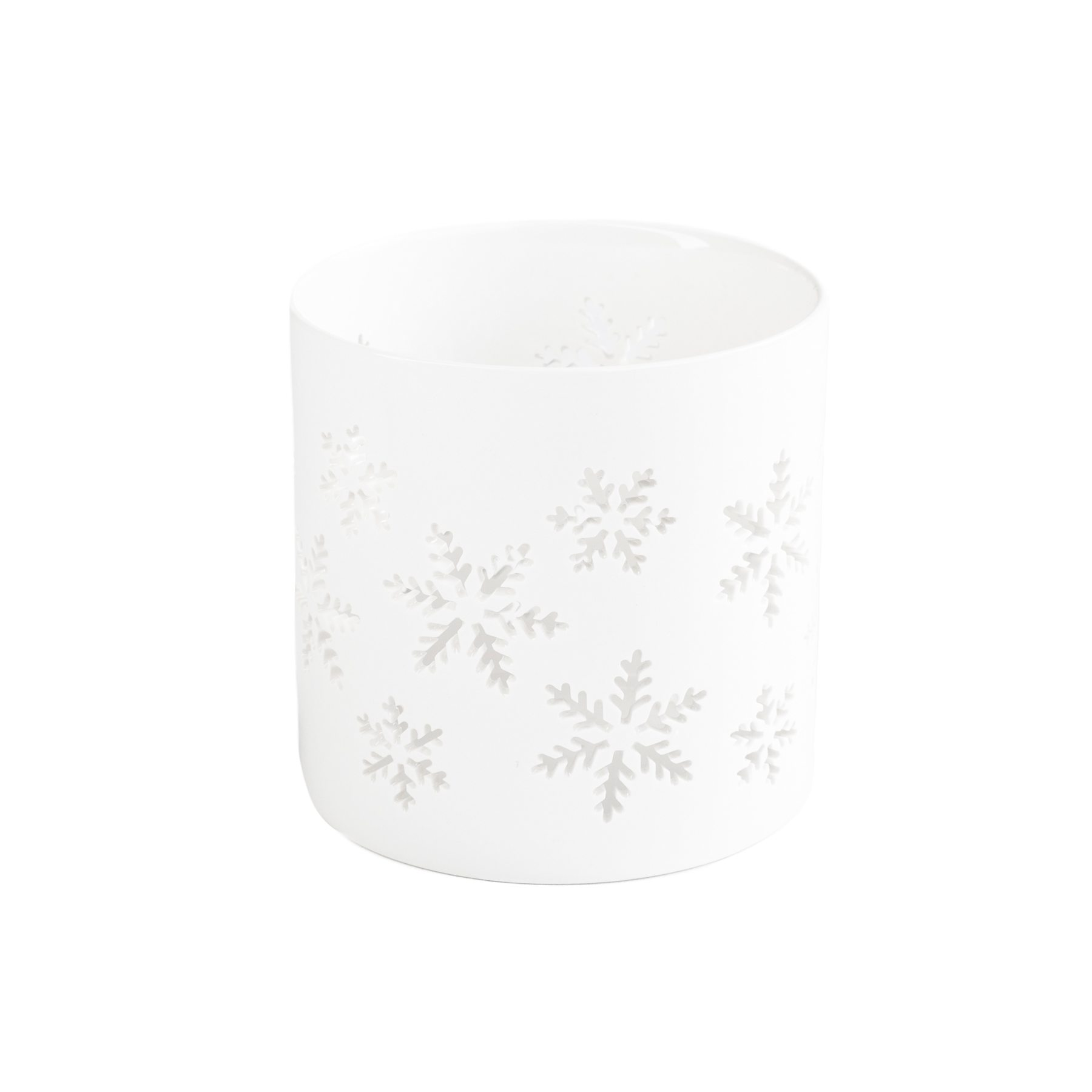 Wykonany z porcelany w czystej bieli, zdobiony subtelnymi wycięciami w kształcie śnieżnych płatków,