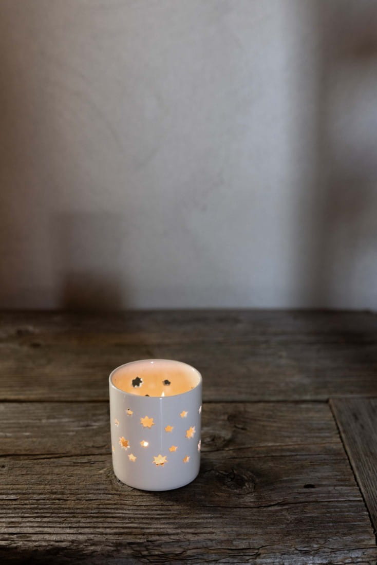Porcelanowy świecznik na tealight z wyciętymi gwiazdkami