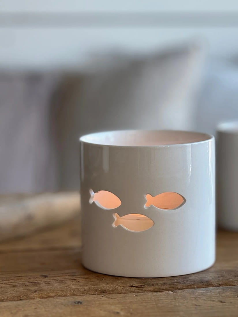 Stylowy świecznik z porcelany z subtelnie wyciętym wzorem rybki, który tworzy piękną grę świateł.