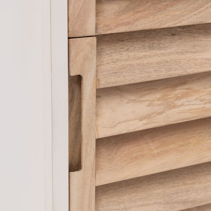 Seria Pacifica obejmuje teraz meble do sypialni, takie jak ten stolik nocny. Szafka wykonana jest z drewna mango w naturalnym kolorze z białą powłoką. Przód ma wygląd żaluzji i zawiera drzwi oraz ukrytą szufladę. Dostępne zarówno dla lewej, jak i prawej strony. Naturalne drewno mango z którego są wykonane meble może odbiegać kolorystycznie od widocznych na zdjęciu !