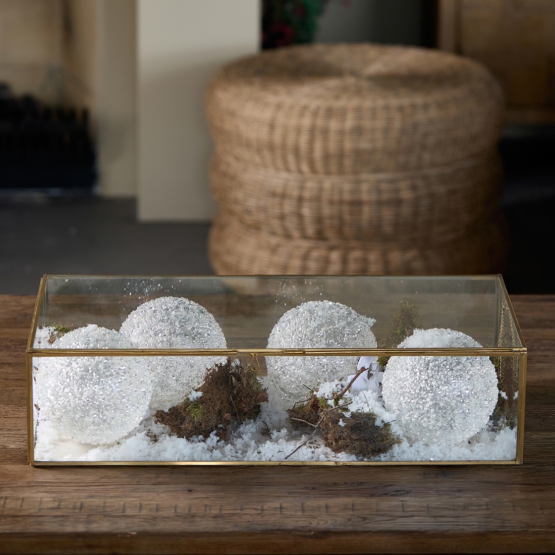 Szklane ścianki i pokrywa zamknięte w delikatnej, metalowej ramie w ciepłym, złotym odcieniu tworzą lekką, a zarazem luksusową formę.