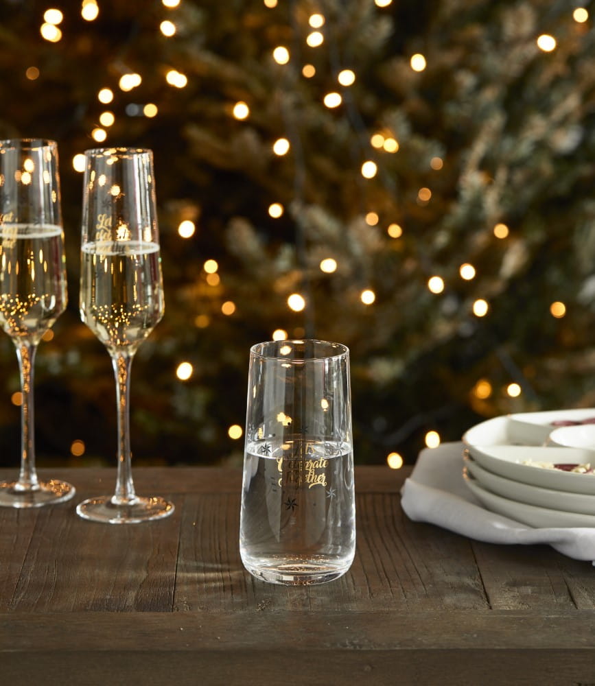 Na tym wysokim szkle widnieje napis „Świętujmy razem” ozdobiony ozdobnymi złotymi literami.