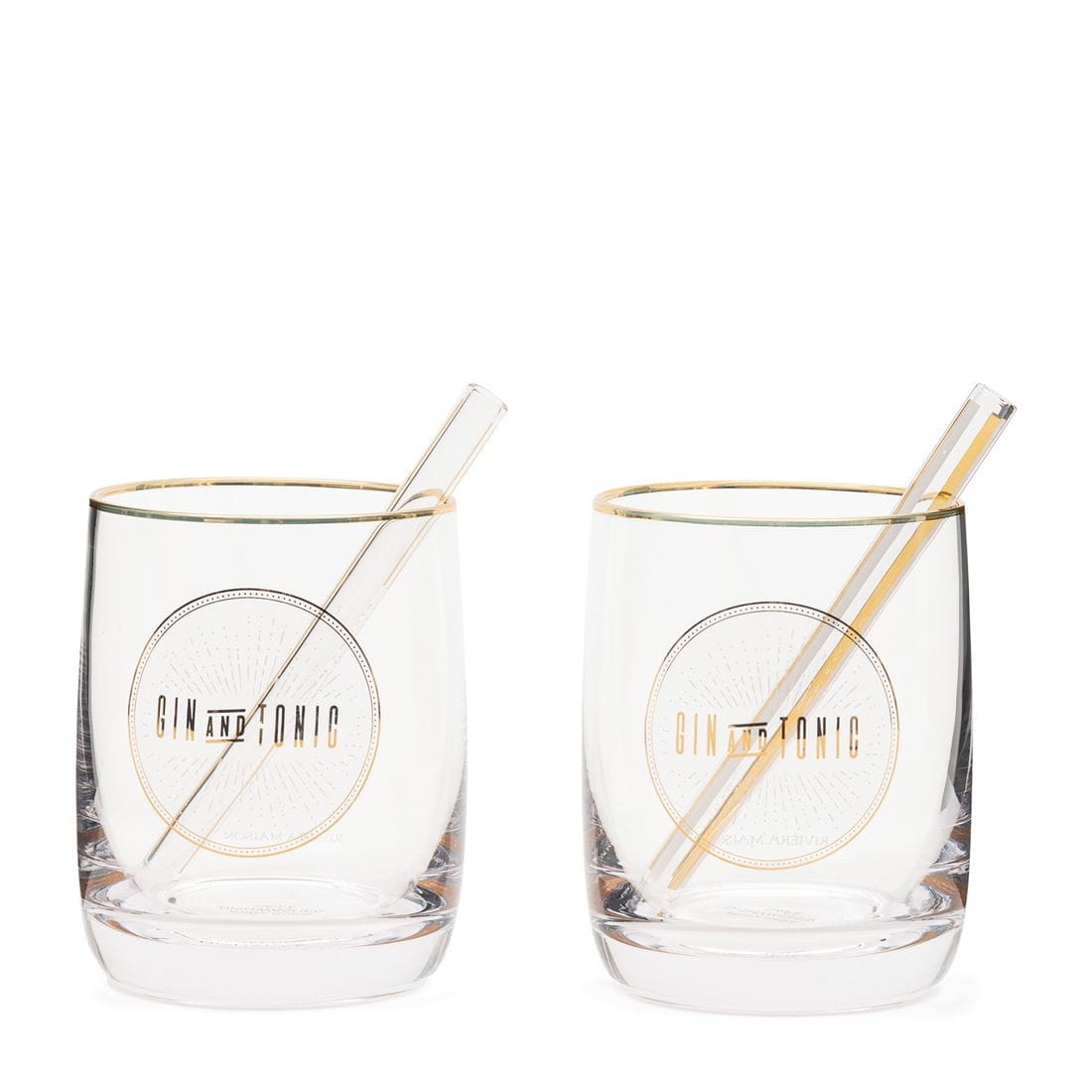 Wspaniały zestaw szklanek ma piękne detale i składa się z dwóch szklanek do ginu z dopasowanymi szklanymi słomkami.