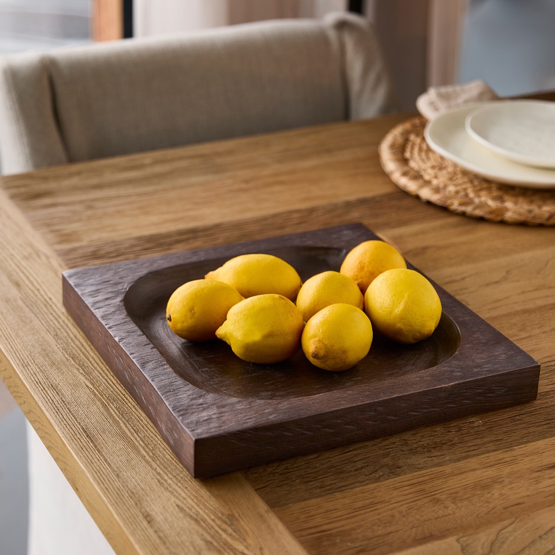 Wyjątkowa taca wykonana z drewna w głębokim, naturalnym odcieniu, która zachwyca swoją prostą, a jednocześnie wyrazistą formą.