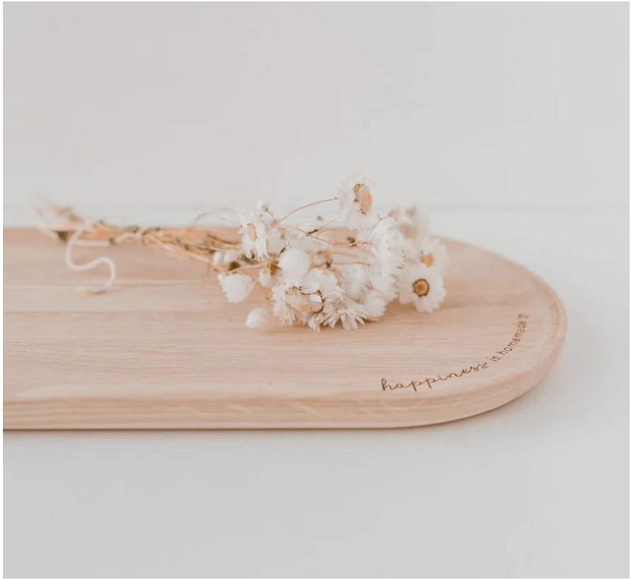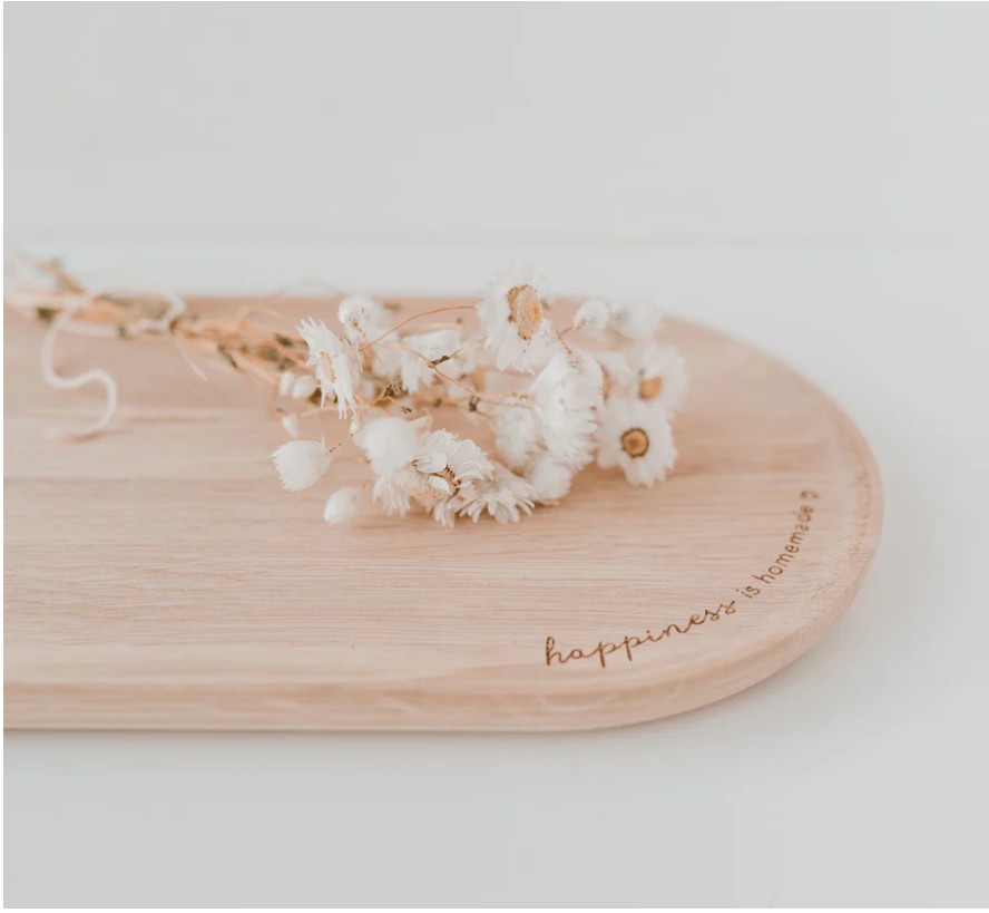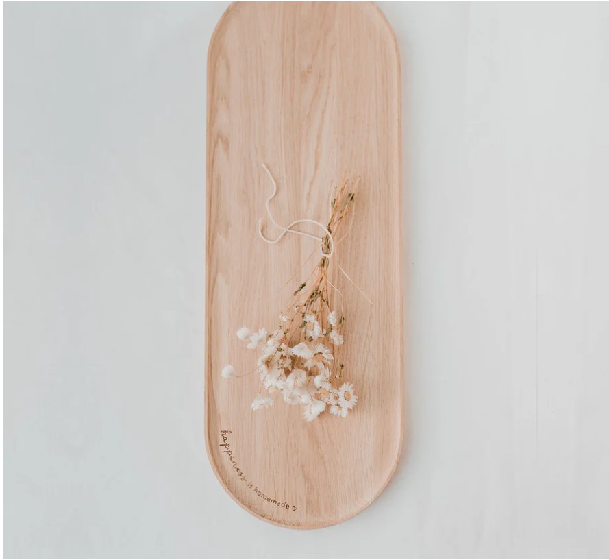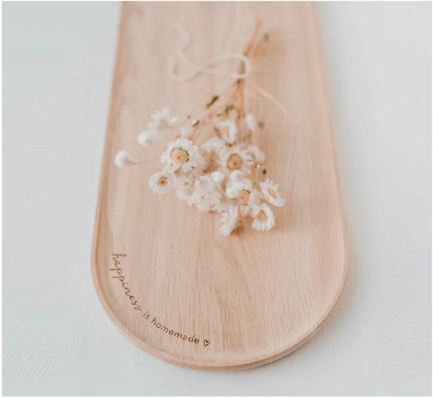 Piękna i praktyczna taca wykonana z naturalnego dębu, ozdobiona napisem „happiness is homemade”.