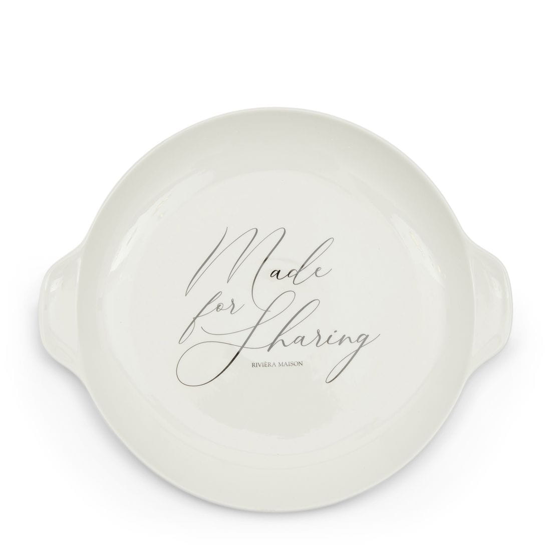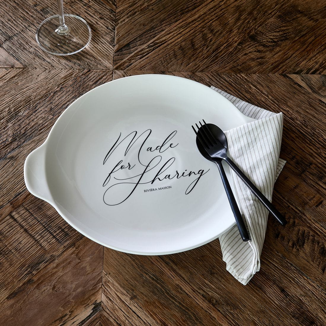Nasz elegancki porcelanowy talerz Made For Sharing ma czarne napisy, które nadają mu stylowego rozmachu.