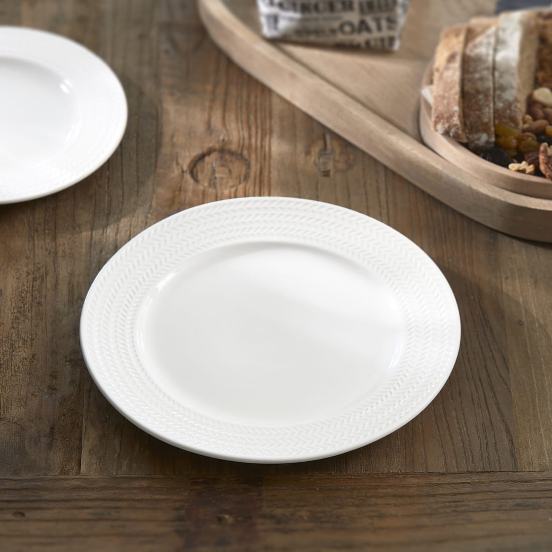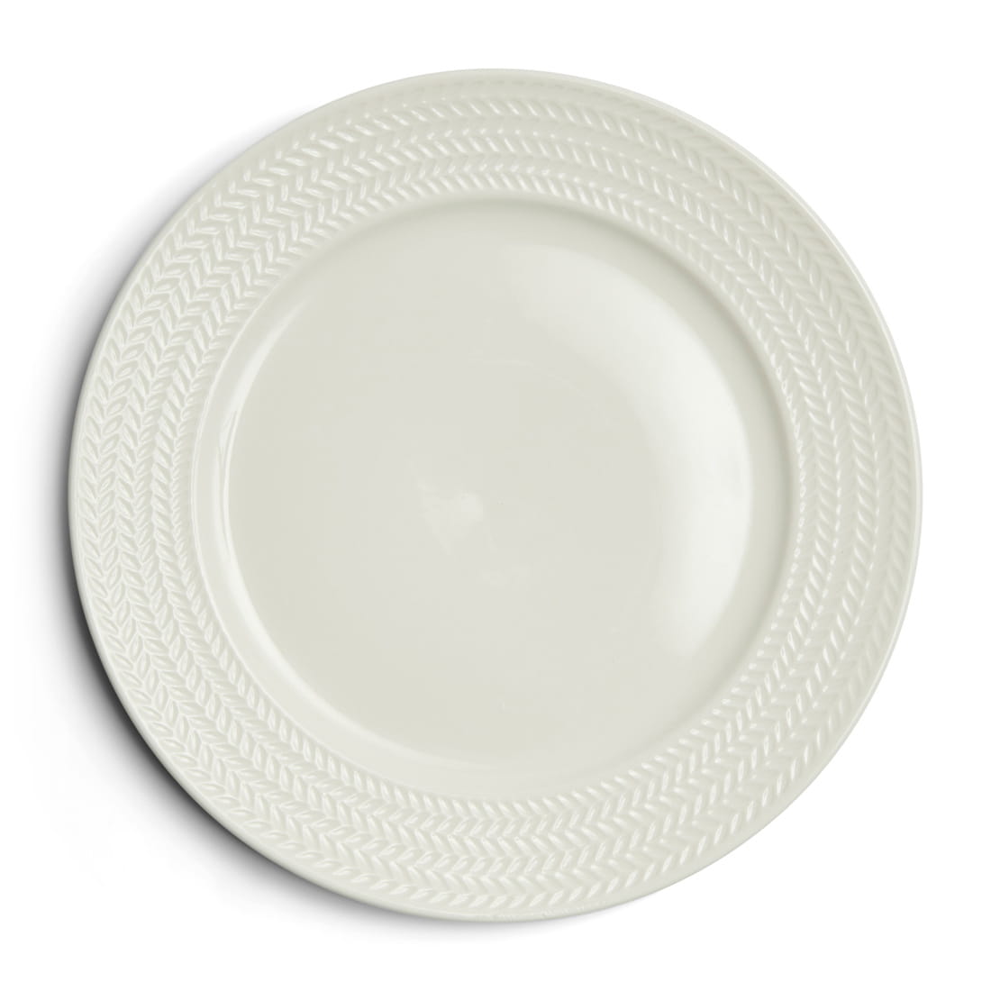 To, co wyróżnia ten talerz obiadowy z serii zastawy stołowej RM Bellecôte, to dekoracyjna obwódka, która wydaje się być spleciona w piękną jodełkę.