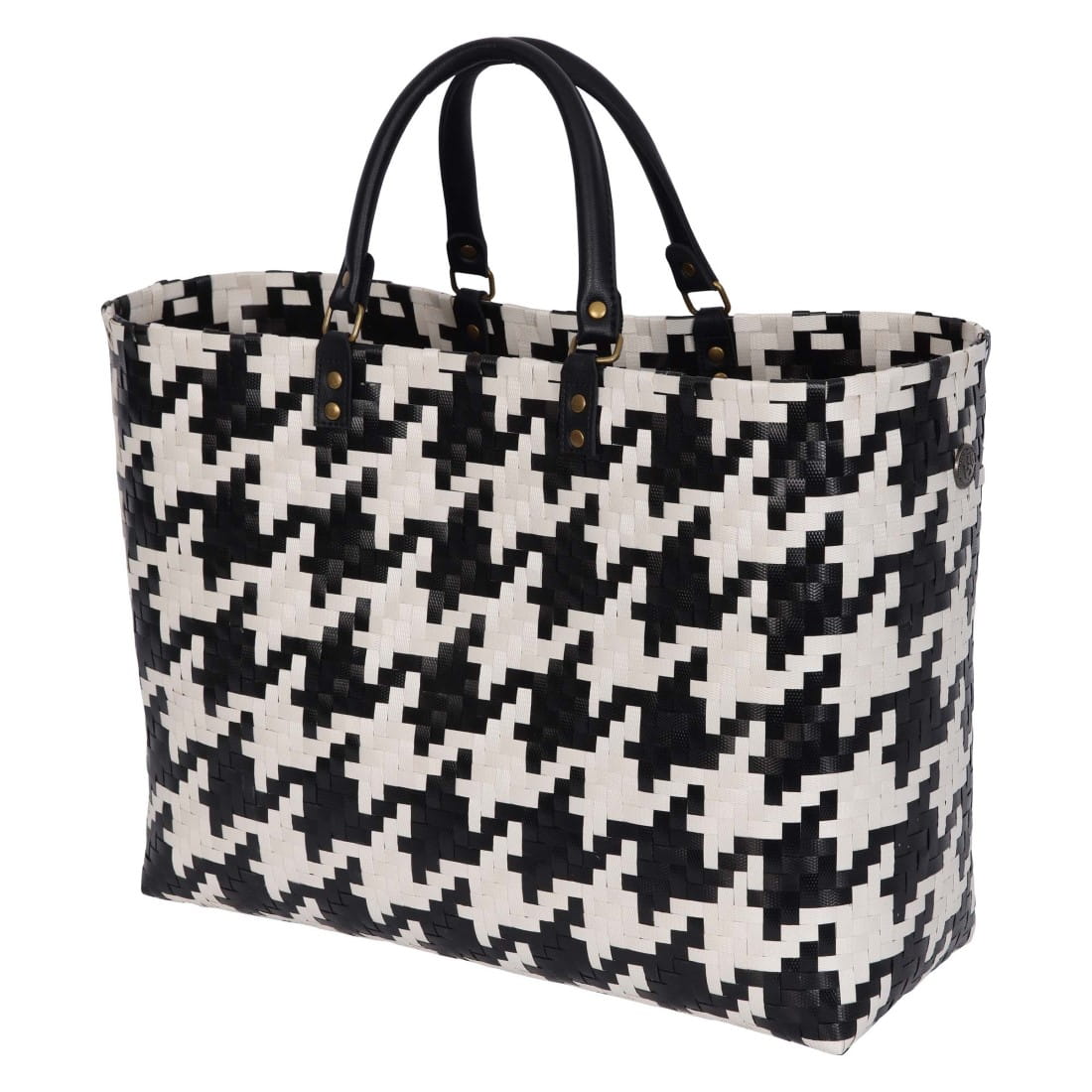„Mayfair” w rozmiarze L to modna, tkana torba z wzorem Pied-de-poule. Lekki shopper do noszenia, a także bardzo wytrzymały w użyciu. Idealna na zakupy lub podczas wizyty na ryneczku. Uchwyty ze skóry PU zapewniają wygodę noszenia i nadają luksusowy wygląd. Przydatny szczegół: wewnątrz znajduje się haczyk, na którym możesz zawiesić na przykład klucze lub okulary przeciwsłoneczne! Szukasz tej samej torby, ale w mniejszym rozmiarze? W takim razie spójrz na shopper Mayfair w rozmiarze XS. Ręcznie robione z plastiku pochodzącego z recyklingu.