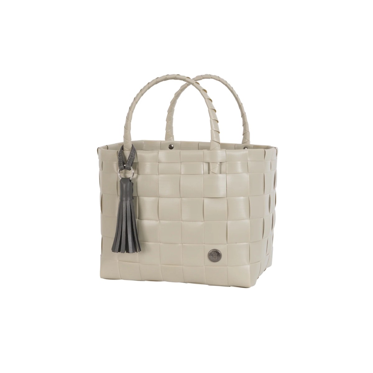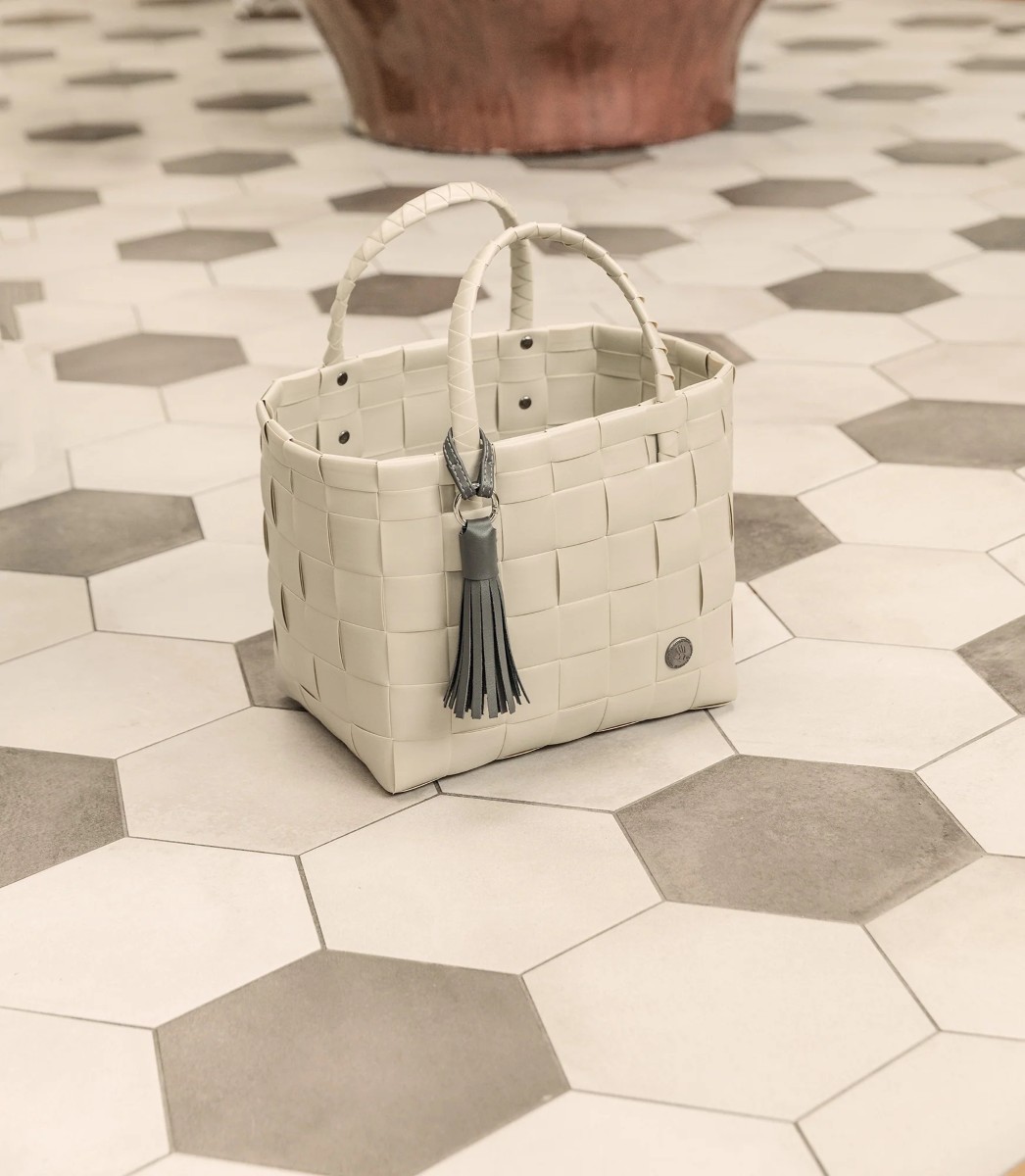 „Mini PARIS”. Na podstawie naszego bestsellera, torby zakupowej PARIS, przedstawiamy teraz mniejszą wersję tego kultowego modelu! Wykonana z wytrzymałego materiału pochodzącego z recyklingu i zaprojektowana tak, aby służyć przez lata. Kompaktowa torba miejska, którą łatwo zabrać do pracy, a jednocześnie wystarczająco pojemną, aby pomieścić codzienne niezbędne rzeczy i szybkie zakupy. Zabawnym detalem jest kontrastujący ciemnym szarym frędzlem przy rączce.
