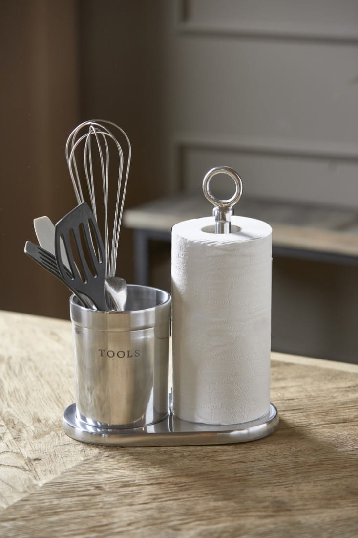 Taca w kolorze srebrnym zawiera uchwyt na rolkę kuchenną i pasujący uchwyt na przybory kuchenne.