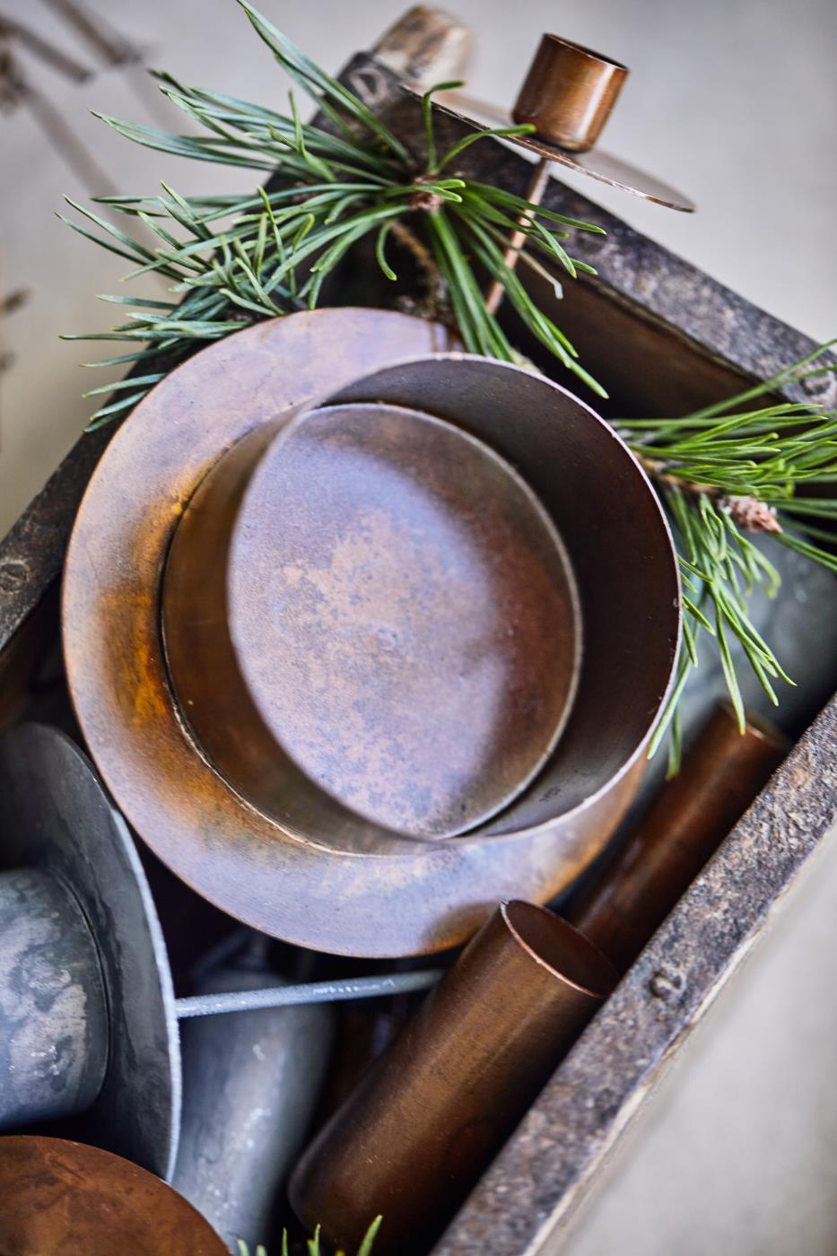 Metalowa konstrukcja w ciepłym, postarzaną odcieniu tworzy stylowy akcent i pięknie komponuje się z naturalnymi gałązkami, szyszkami, mchem czy świeżymi roślinami. Cylindryczny uchwyt utrzymuje klasyczne świece stołowe, zapewniając im bezpieczne i stabilne oparcie.