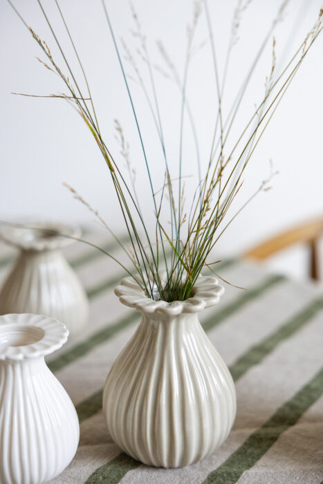 Smukła forma z delikatnymi, pionowymi żłobieniami pięknie podkreśla naturalne kompozycje – zarówno pojedyncze gałązki, trawy, jak i lekkie bukiety.