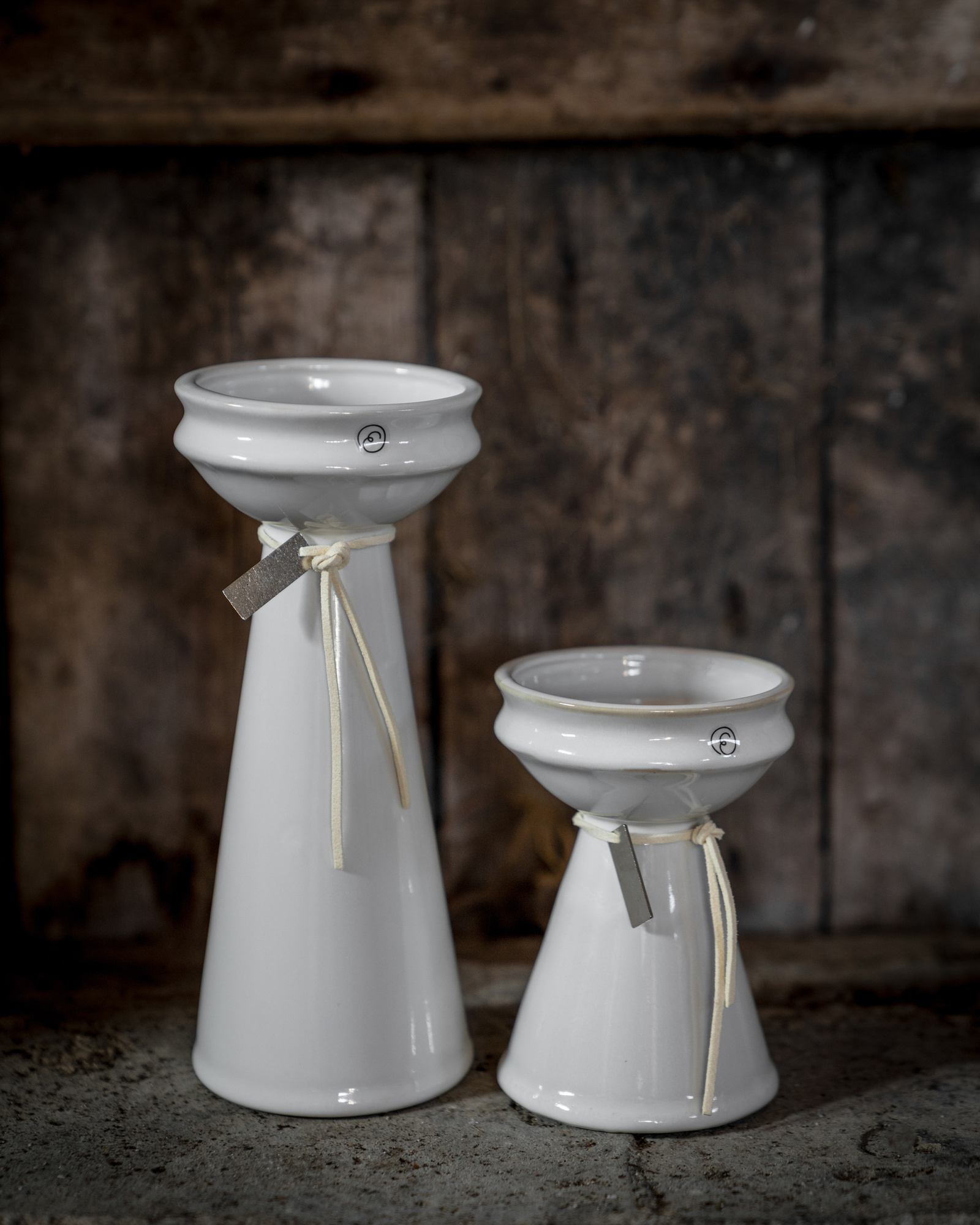 Wazon ma klasyczny kształt o zwężonej podstawie i charakterystyczny detal — skórzany sznurek z zawieszką ERNST, który dodaje mu subtelnego,