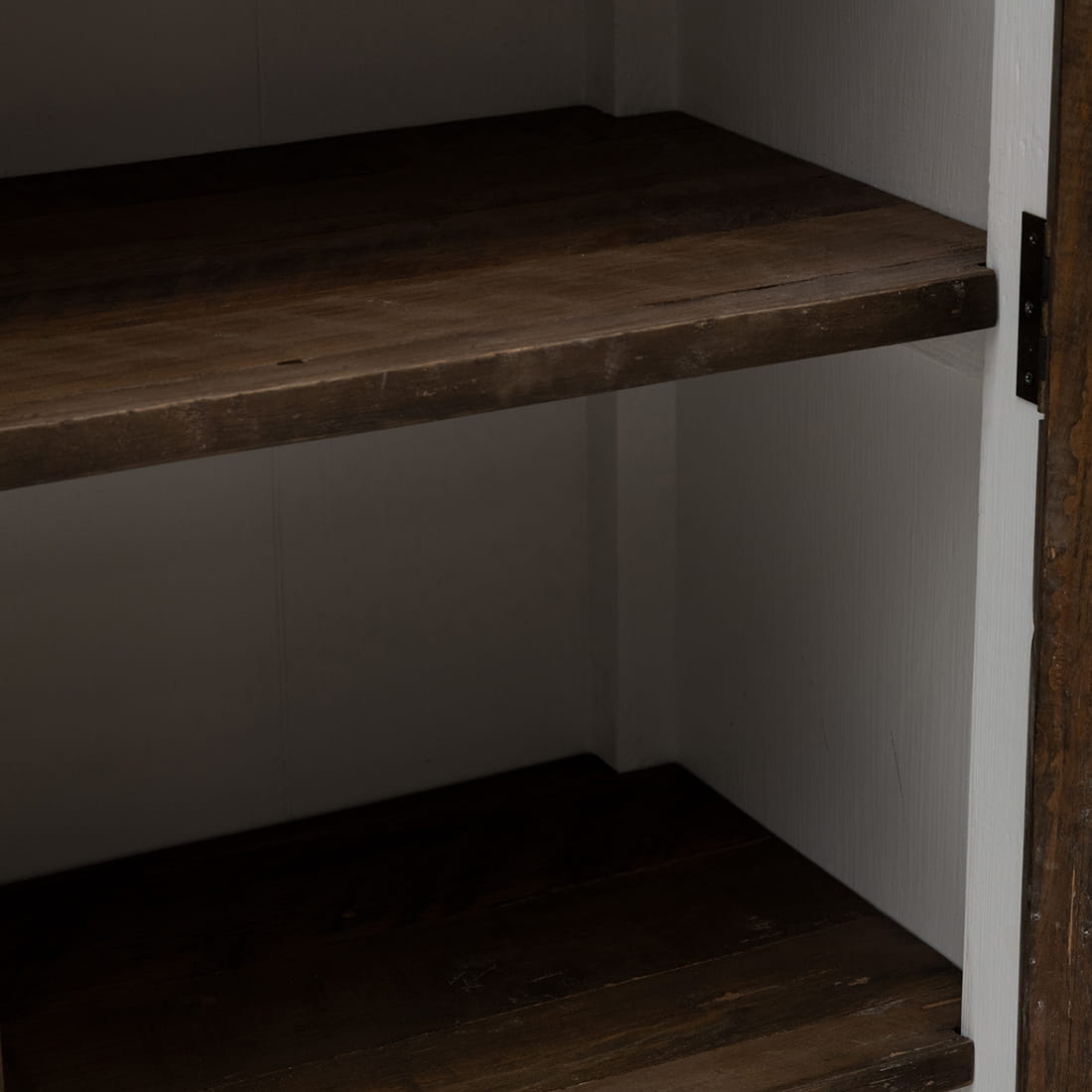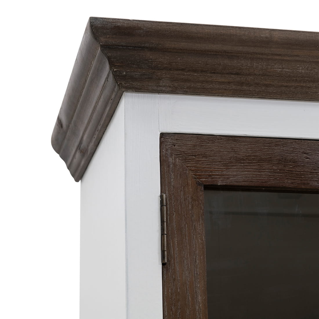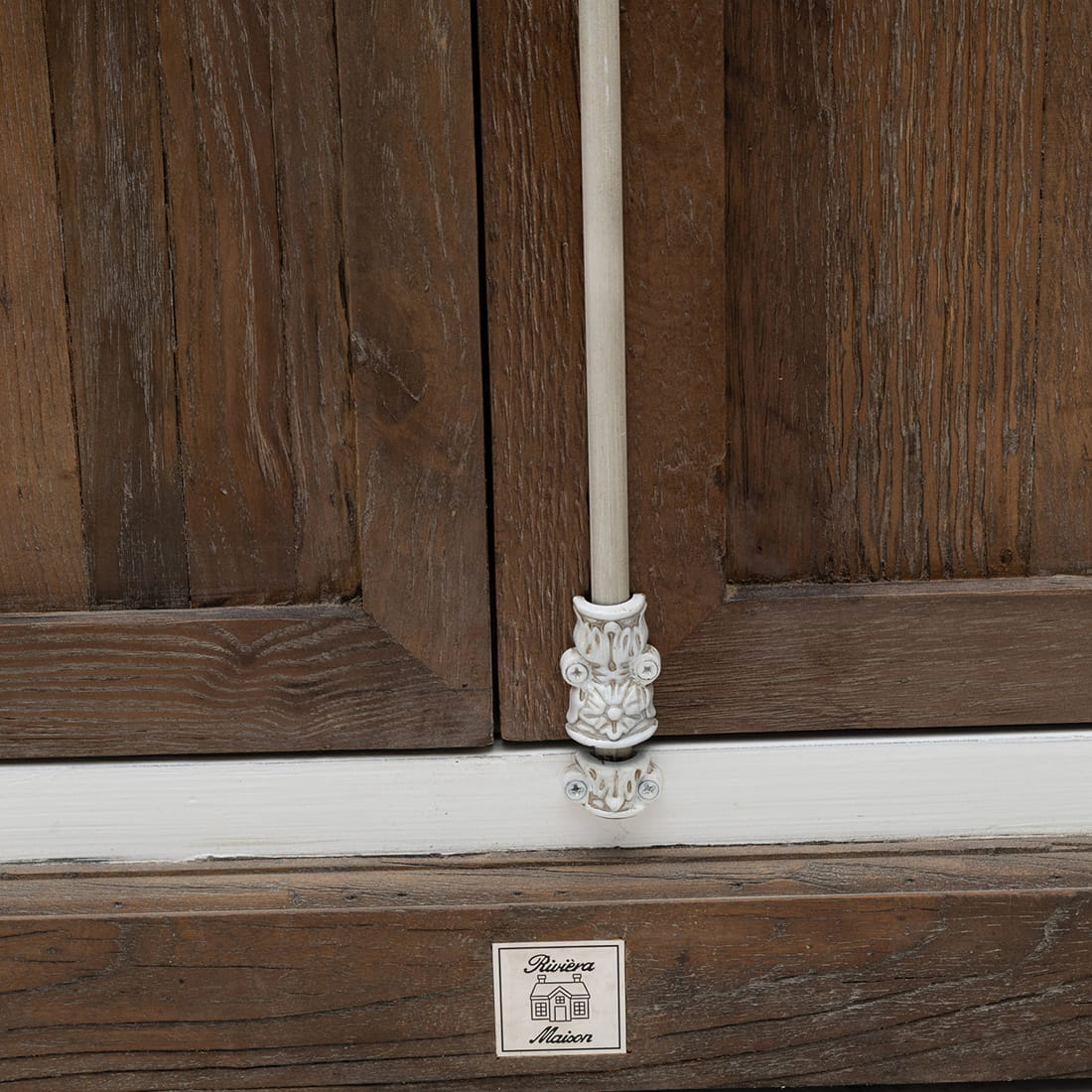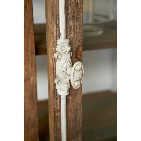 Piękna witryna w okalającej ją białej drewnianej ramie, kontrastuje z oryginalnymi drzwiczkami wykonanymi z solidnego drewna pochodzącego z Indii.