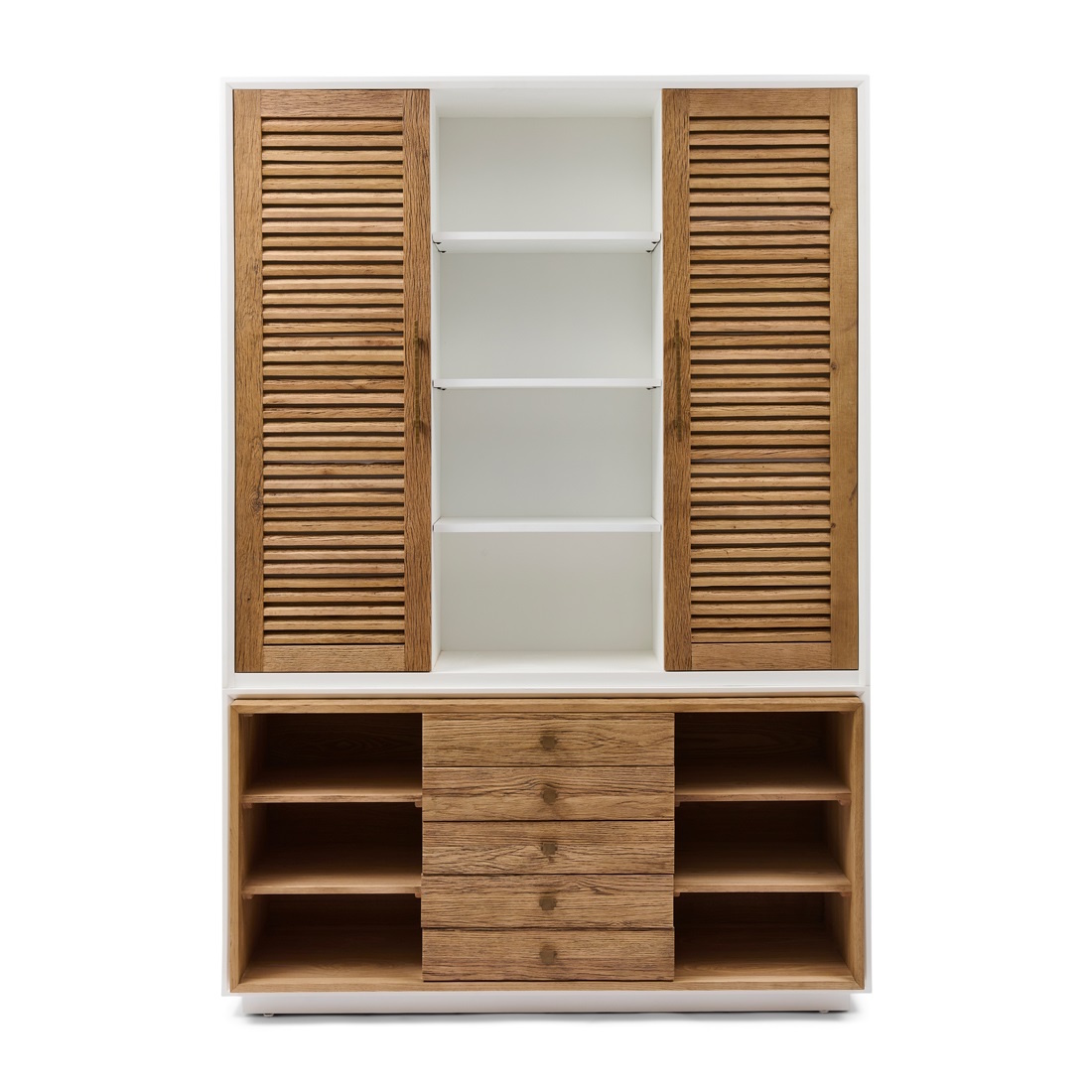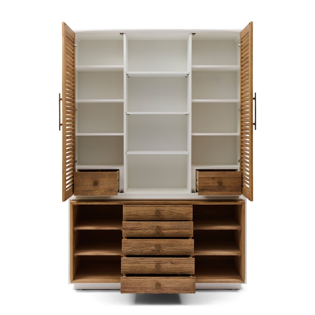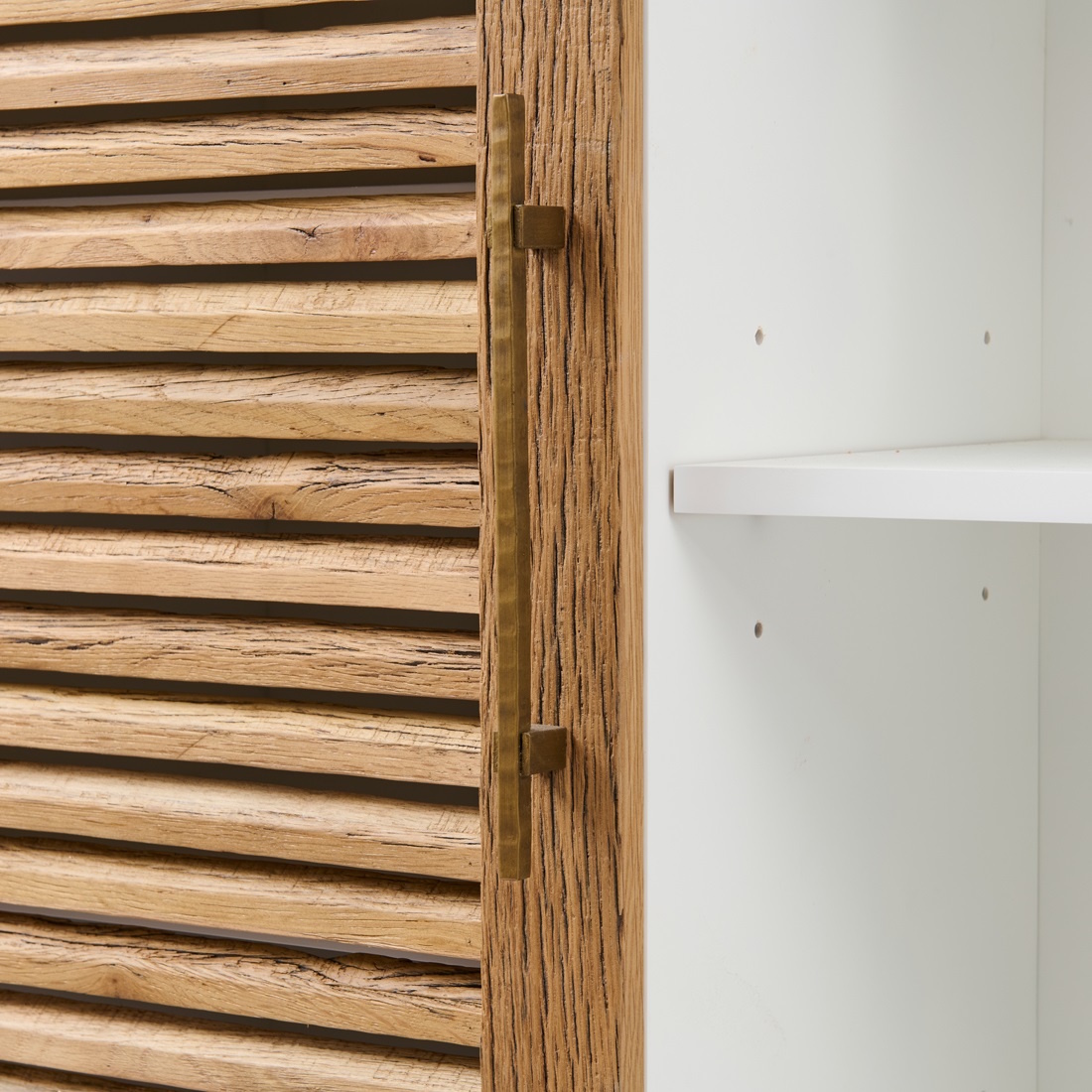 Komoda Lake to elegancki dodatek do Twojego wnętrza, a drewniane drzwi dodają mu ciepłego akcentu. Drzwi mają żaluzje i szkło, tworząc wyrafinowany i przewiewny wygląd.
