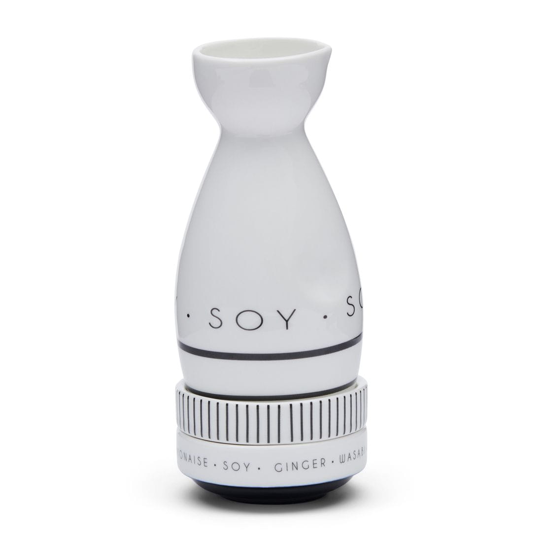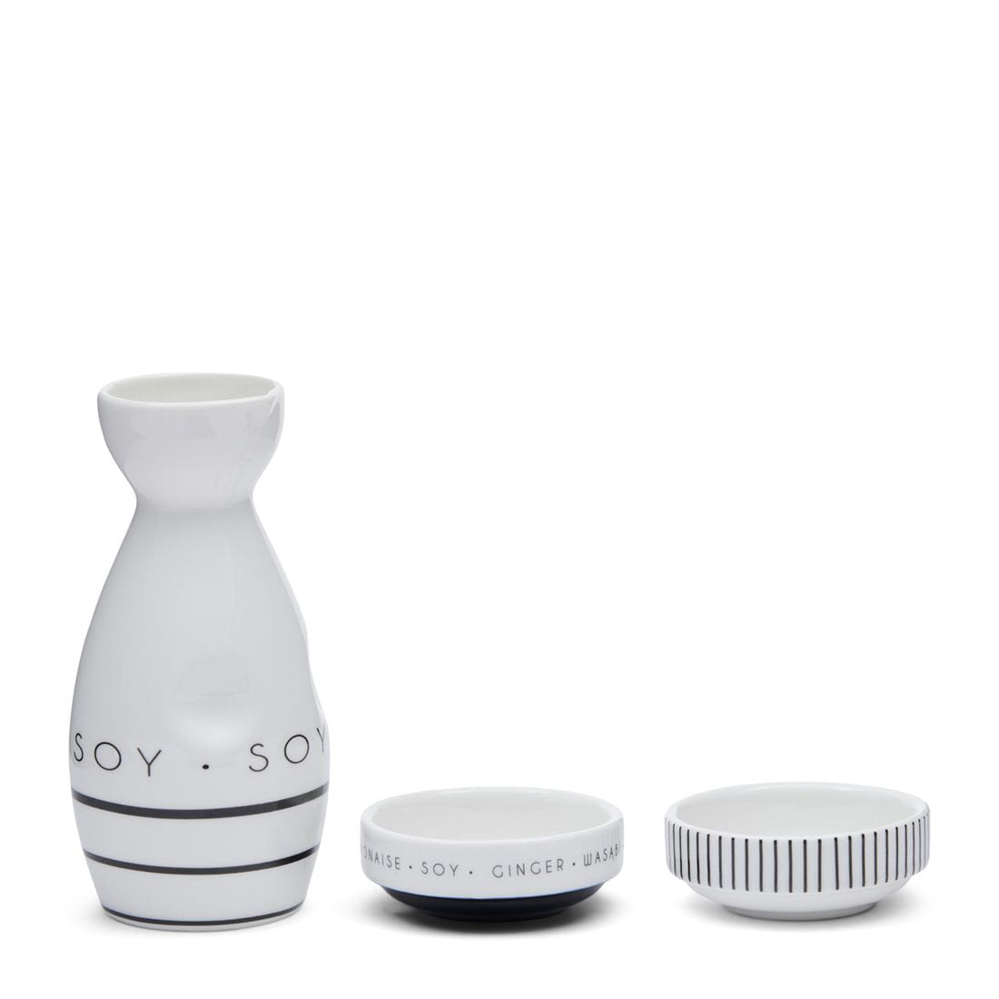Butelka na sos sojowy i dwie miski na imbir i wasabi lub do maczania.