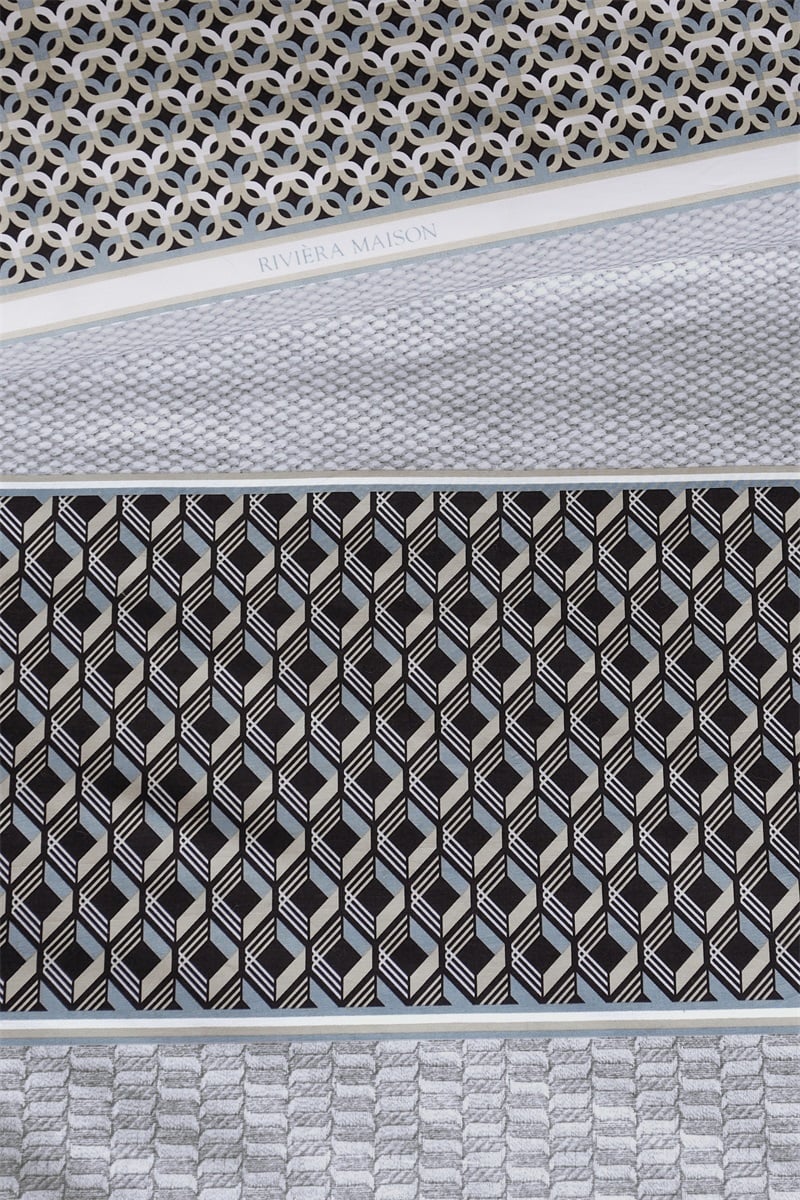 Pościel Lawrence Blue Grey z kolekcji jesień/zima Rivièra Maison to designerska propozycja inspirowana stylem retro z lat 70. i 80. Geometryczny nadruk w odcieniach błękitu, szarości i czerni wprowadza do sypialni odważny, a zarazem elegancki akcent, który nadaje wnętrzu wyjątkowego charakteru.