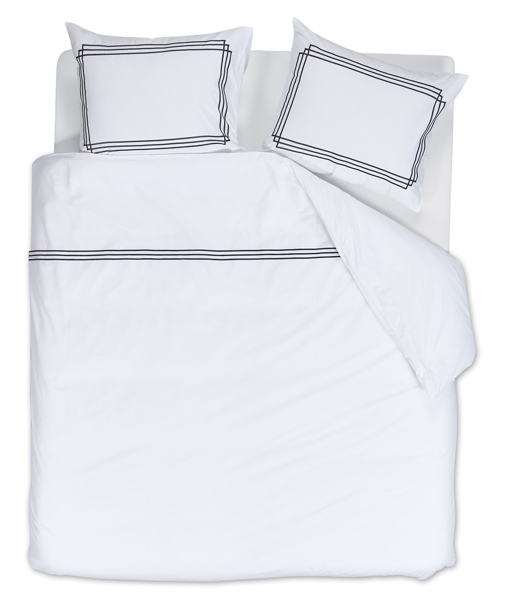 Śnieżnobiała tkanina została ozdobiona delikatnymi, piaskowymi liniami w odcieniu granatu, które nadają całości wyrafinowany charakter. Prosty, a zarazem elegancki wzór sprawia, że pościel idealnie wpisuje się zarówno w klasyczne, hotelowe aranżacje, jak i nowoczesne, jasne wnętrza.